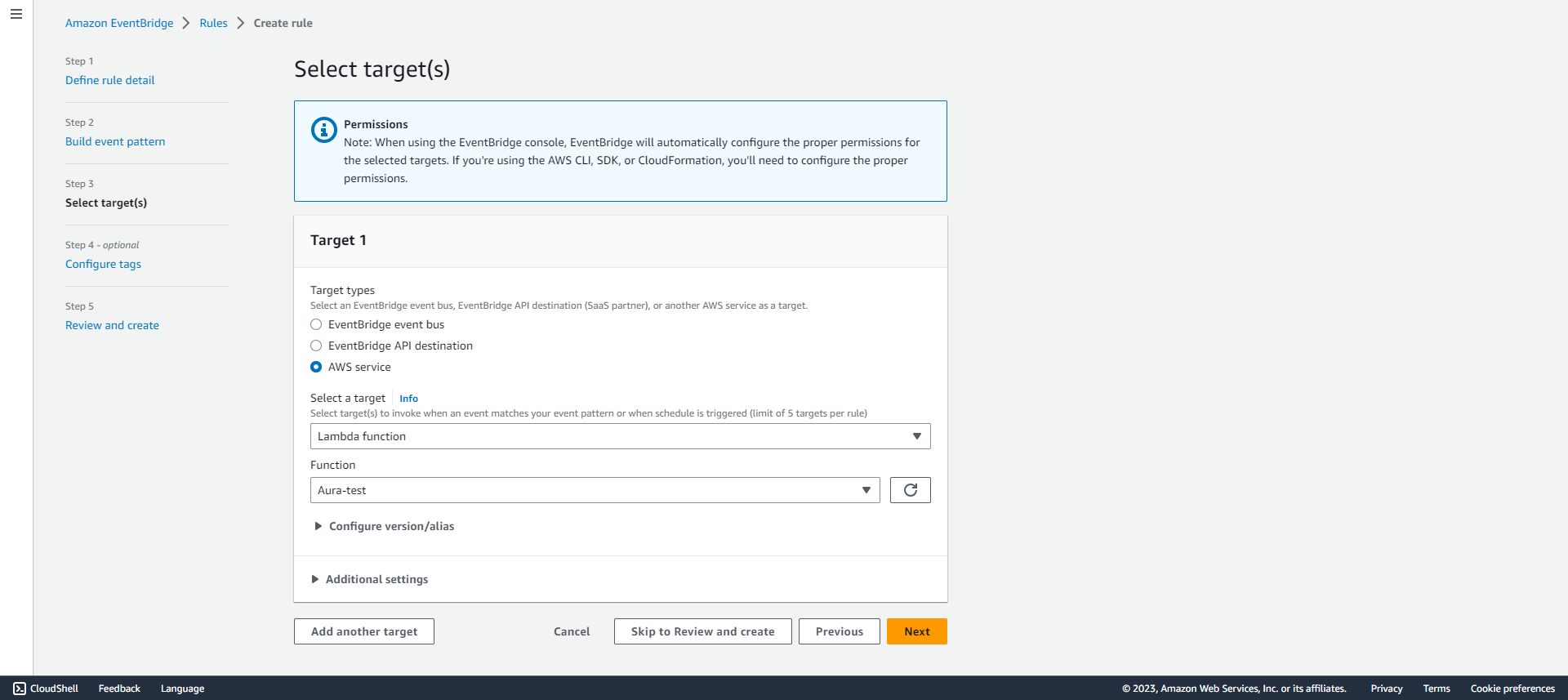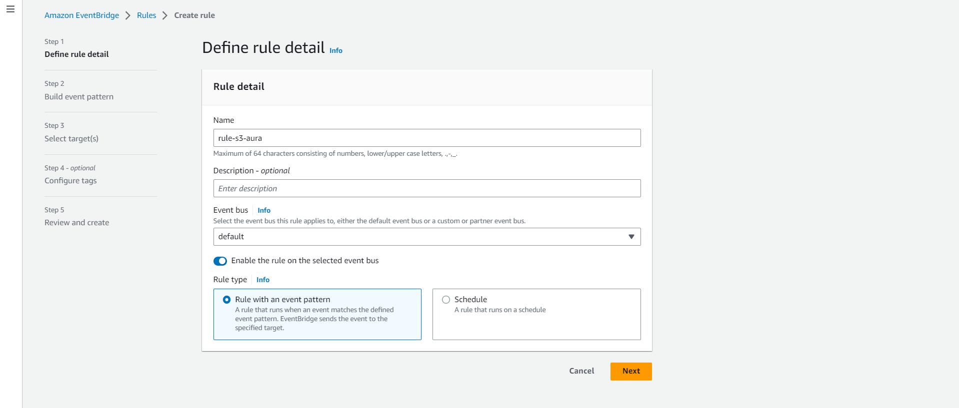 To begin the implementation, we will create an Event Bridge rule, which will be used for invoking a Lambda Function.
