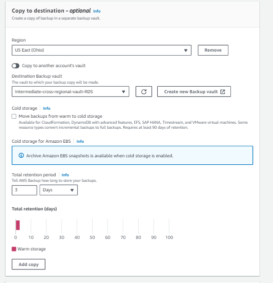 Configure copy settings to an intermediate vault in the backup region, streamlining the process of moving backups between regions.