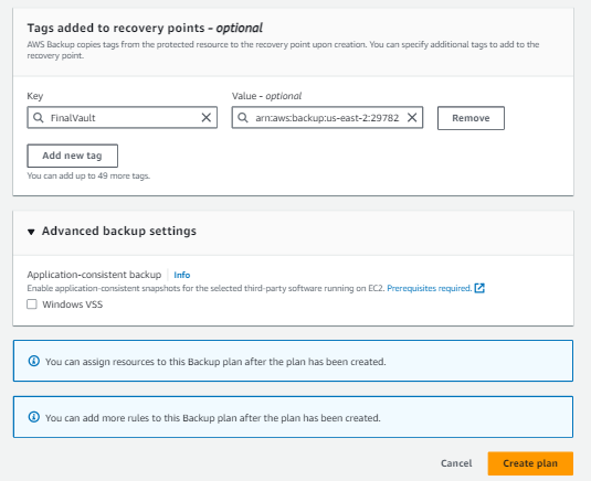 Enhance backup management by adding tags; a key tag to include is 'FinalVault' with a value representing the ARN of the backup vault in the backup account in the backup region.