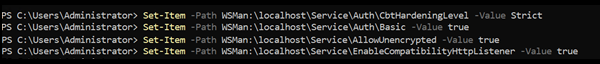 Set-Item -Path WSMan:\localhost\Service\AllowUnencrypted -Value true Set-Item -Path WSMan:\localhost\Service\EnableCompatibilityHttpListener -Value true Set-Item -Path WSMan:\localhost\Service\Auth\CbtHardeningLevel -Value Strict Set-Item -Path WSMan:\localhost\Service\Auth\Basic -Value true
