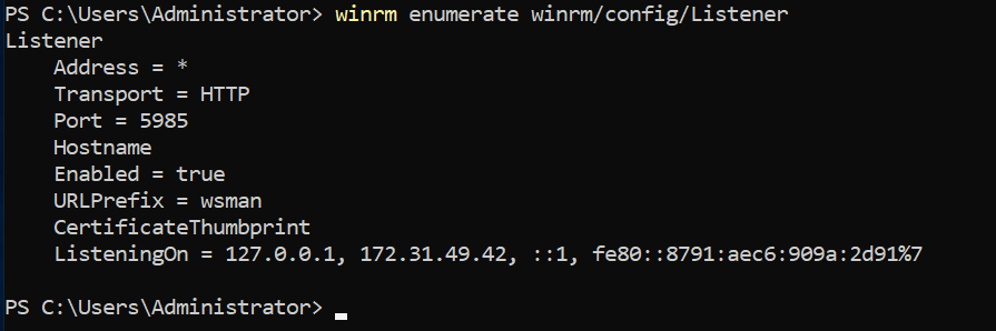 - The WinRM service listens for requests on designated ports, each requiring a created and configured listener. To review the existing listeners active on the WinRM service use below command: