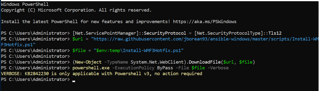 [Net.ServicePointManager]::SecurityProtocol = [Net.SecurityProtocolType]::Tls12 $url = "https://raw.githubusercontent.com/jborean93/ansible-windows/master/scripts/Install-WMF3Hotfix.ps1" $file = "$env:temp\Install-WMF3Hotfix.ps1"Run the below command to execute the script: