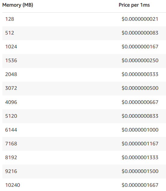 Price per 100 ms (based on memory allocation) = $0.000001667 (for 512MB of memory)