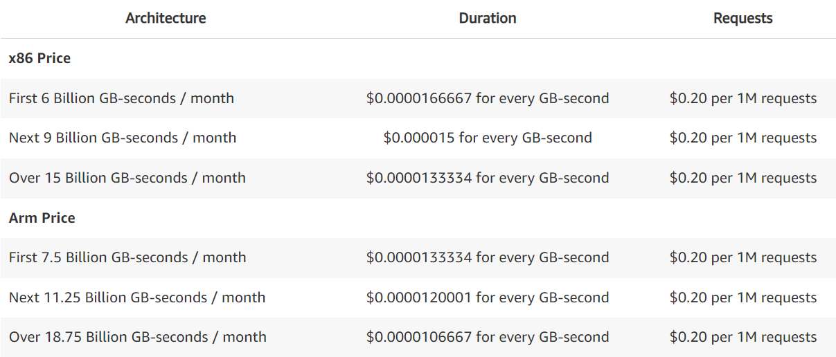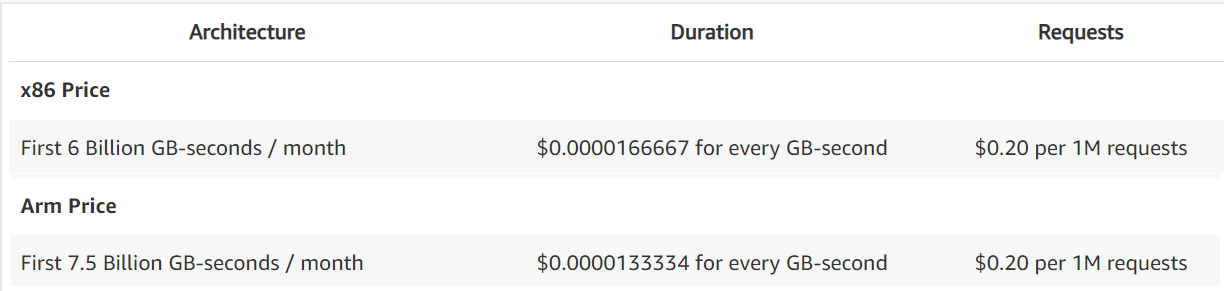 Note: Requests are priced per million, with the first million free, while duration is billed per 100 milliseconds.