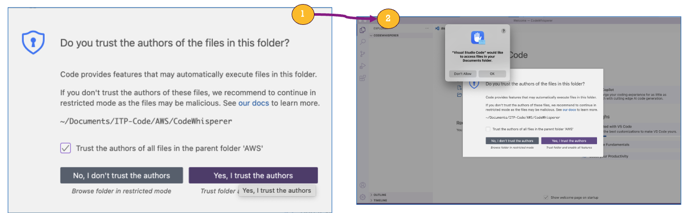 Launch Visual Studio Code, and create folder name CodeWhisperer (if you are a mac user, please acknowledge the below prompt and proceed)