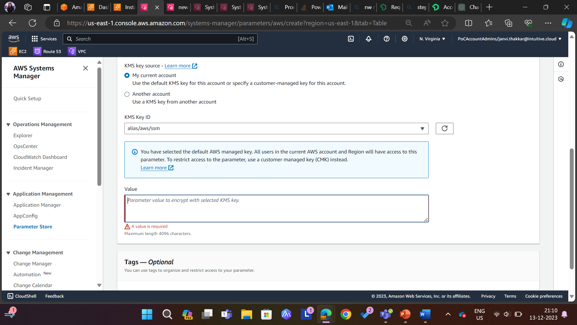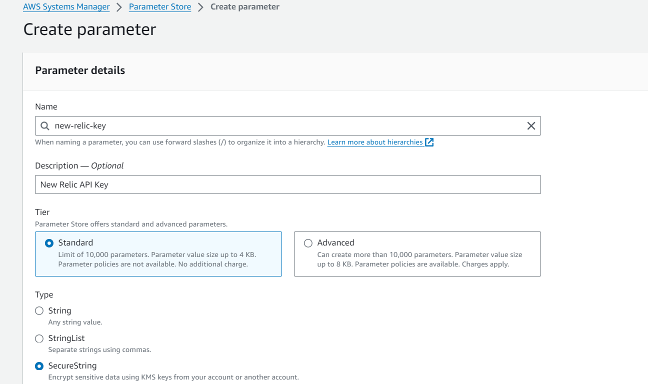 - Make sure to add necessary details and select SecureString as a Type for the parameter.