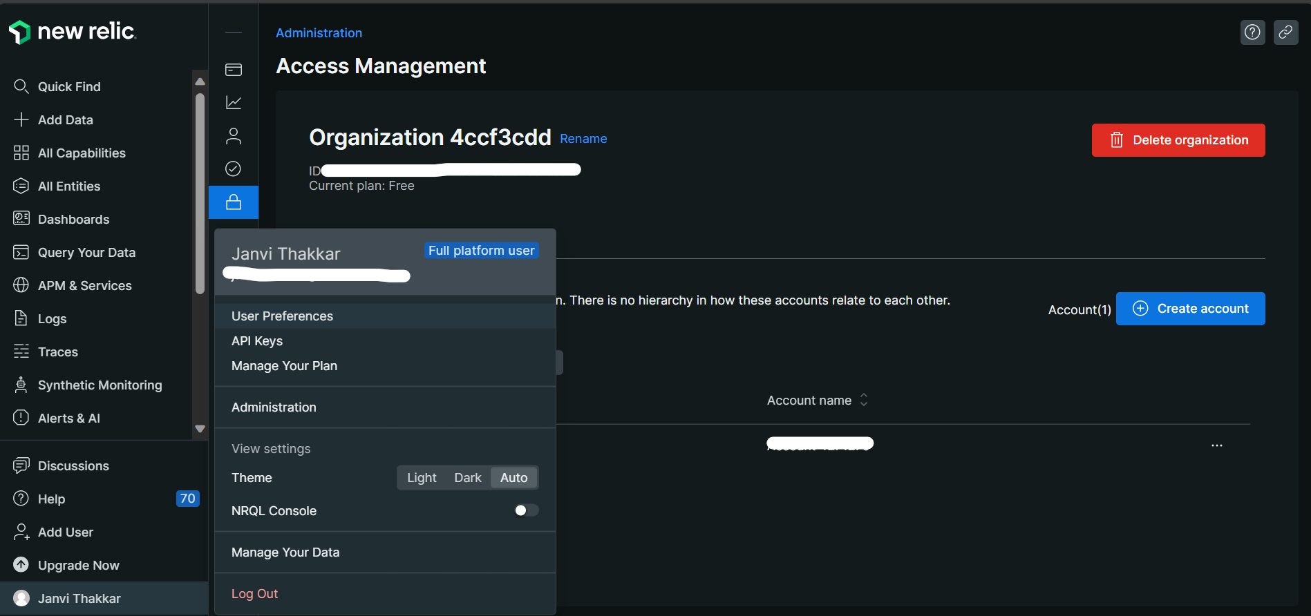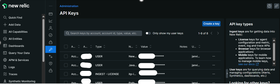 - We first need to create the API Key, for that purpose go to New Relic Dashboard> User > API Keys.