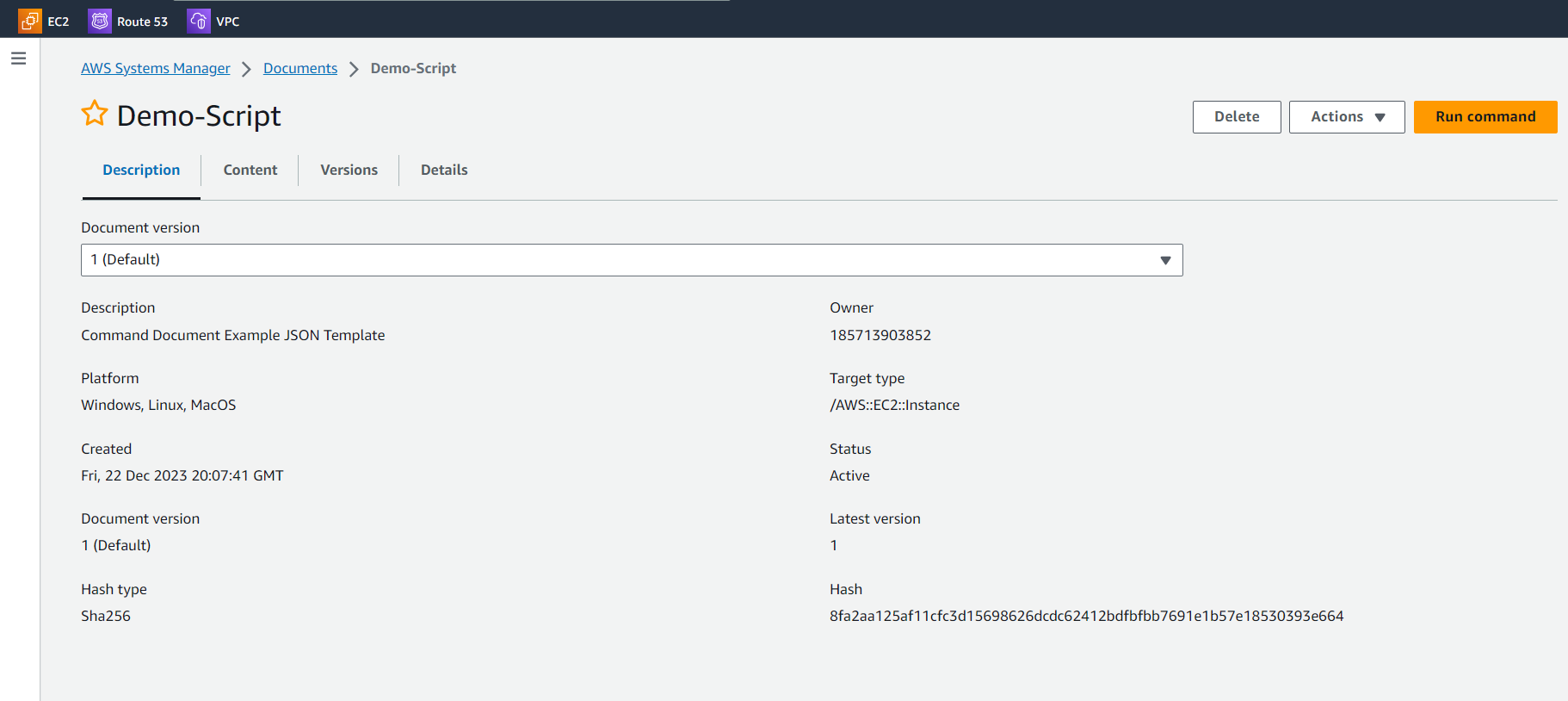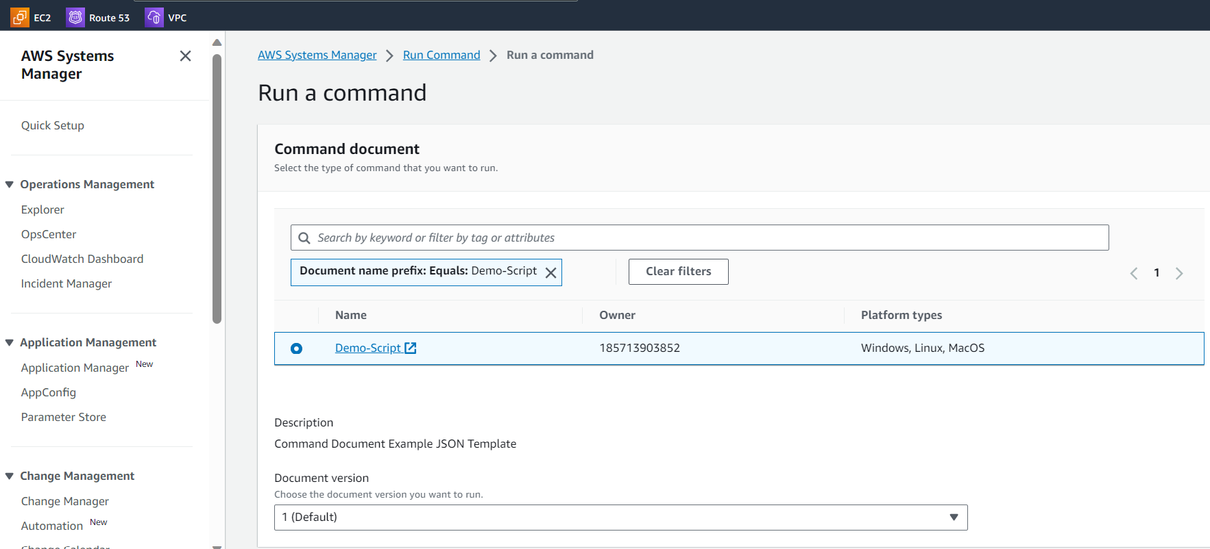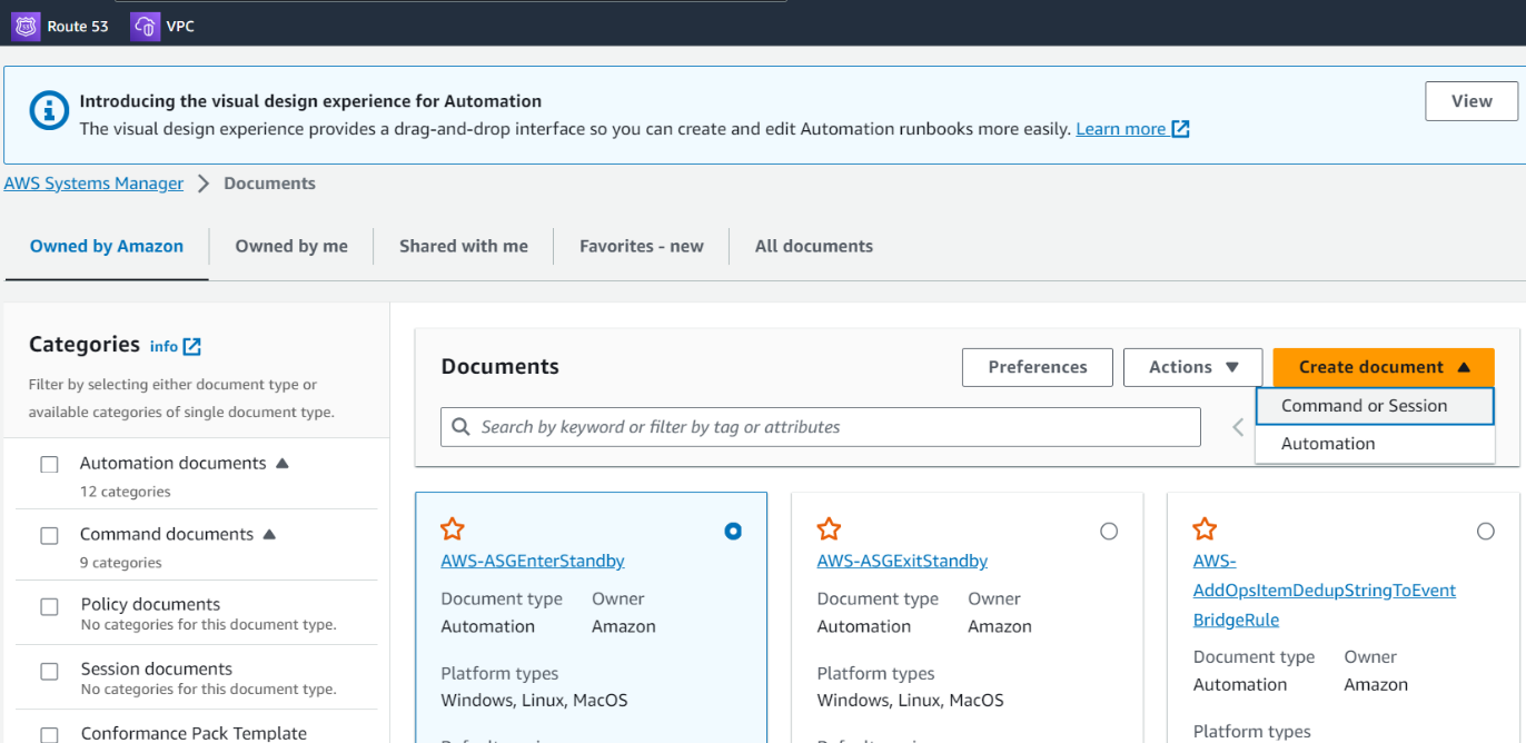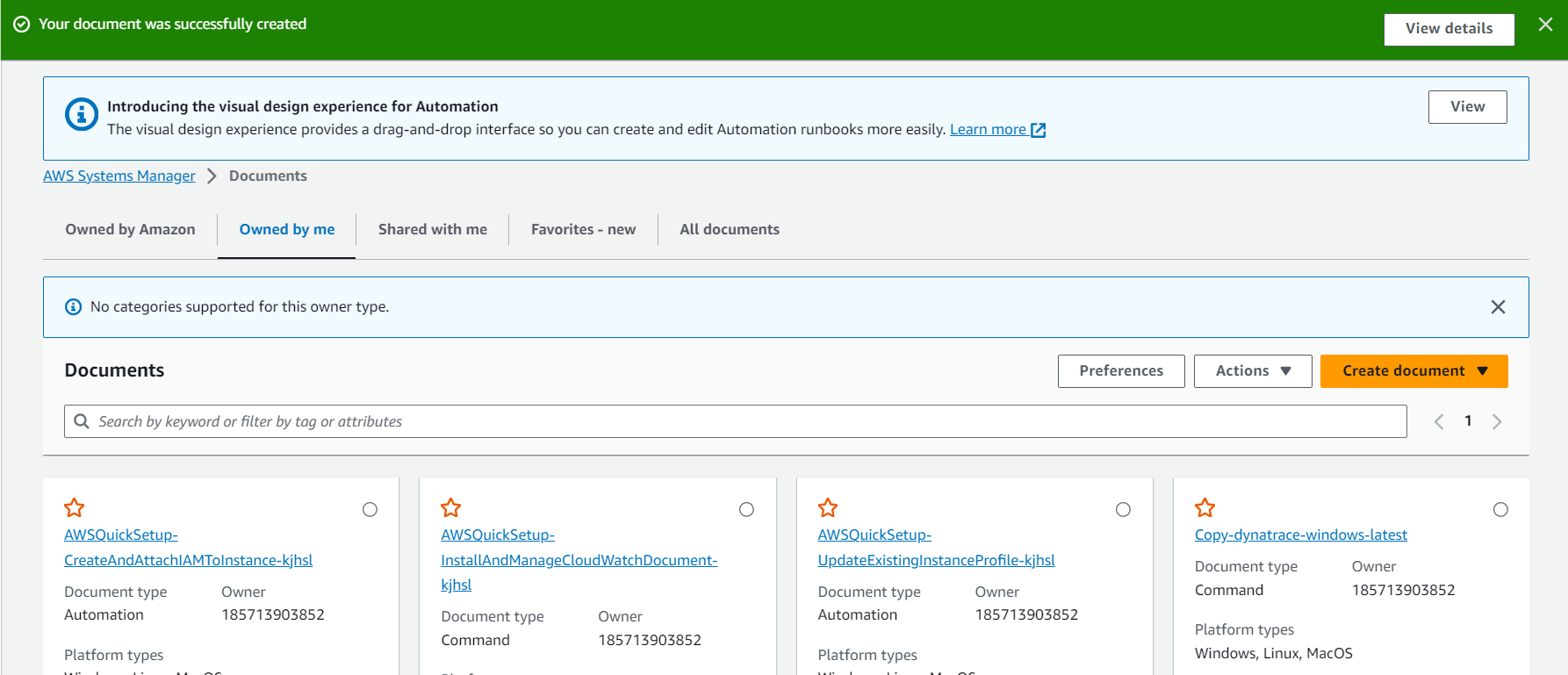 - Once the document gets created, you will be able to see it in the list of documents. Head over to AWS System Manager > Documents > Owned by me.