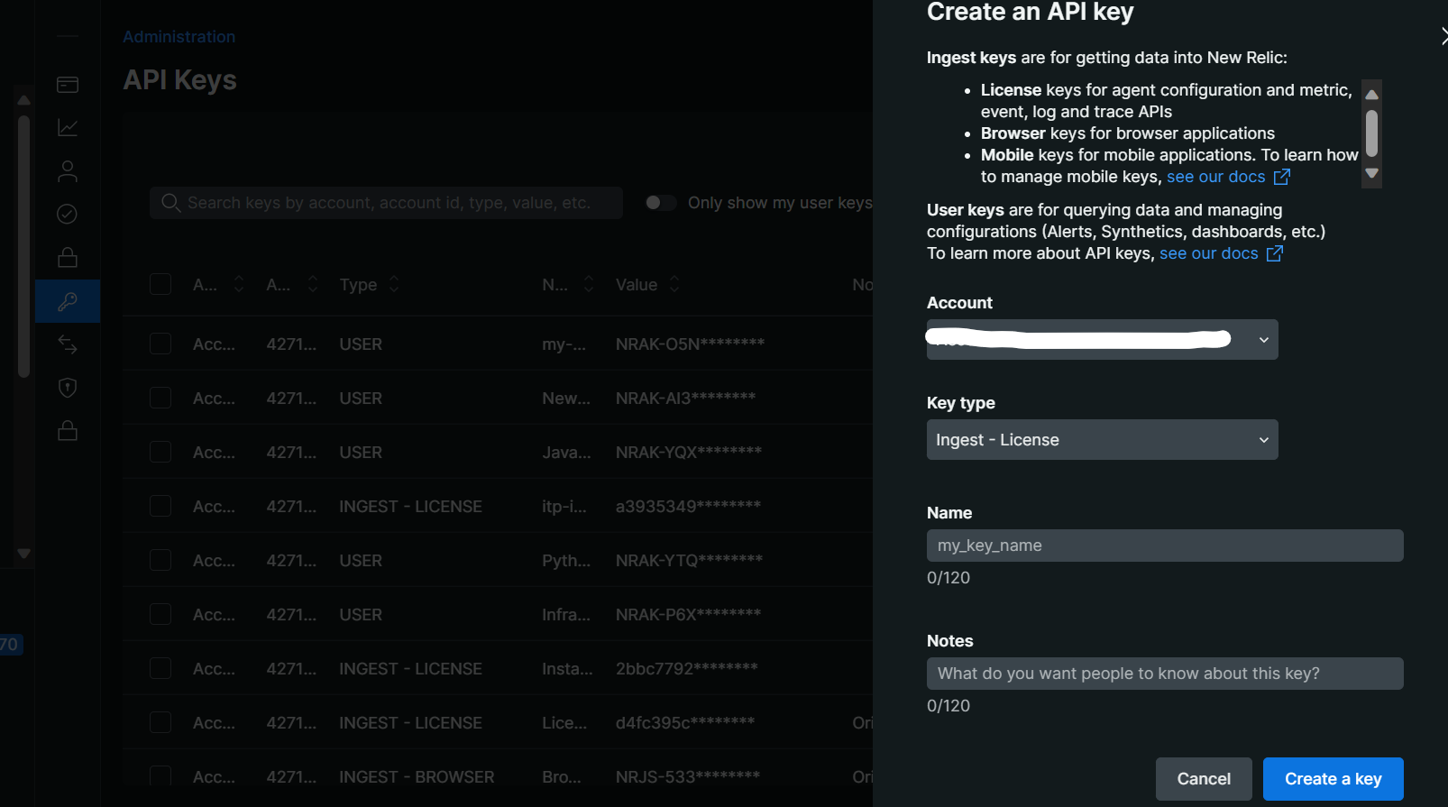 - Enter the necessary details. Make sure to select the key Type as a Ingest-License and click on Create a key button.