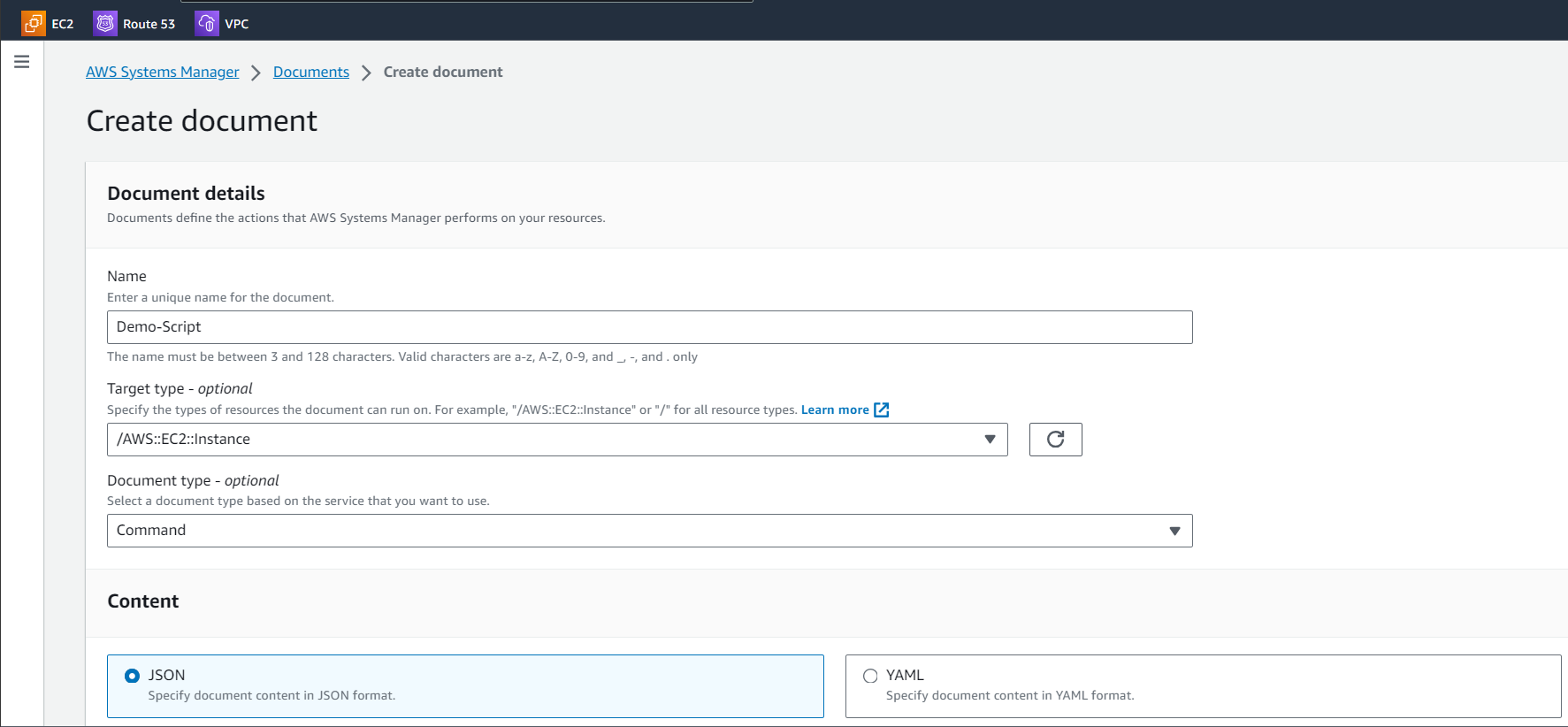 - Enter the appropriate Name. It should be unique across all the documents in your AWS environment.