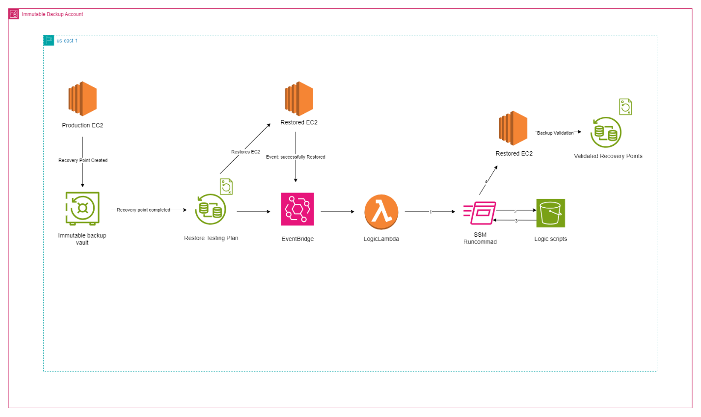The above architecture uses AWS recovery testing plan to recover an EC2 from a backup vault and use ‘SSM Run Command’ to run a script from a S3 bucket on the restored EC2 to scan the restored EC2 for the presence of a specific ransomware files with extension of ‘.ryk’.
