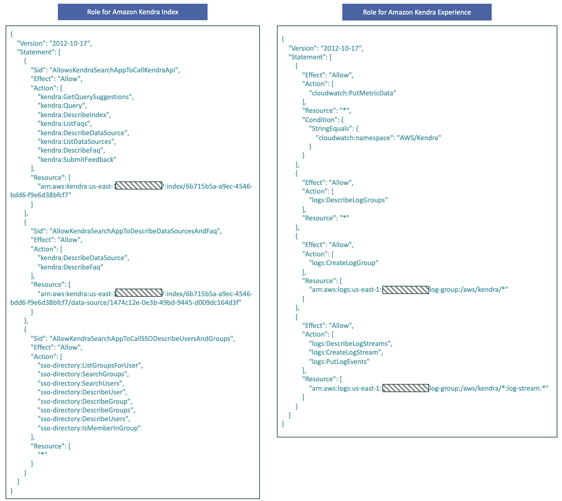 Let’s compare two roles - say the service role for Amazon Kendra Index and Experience to understand better.
