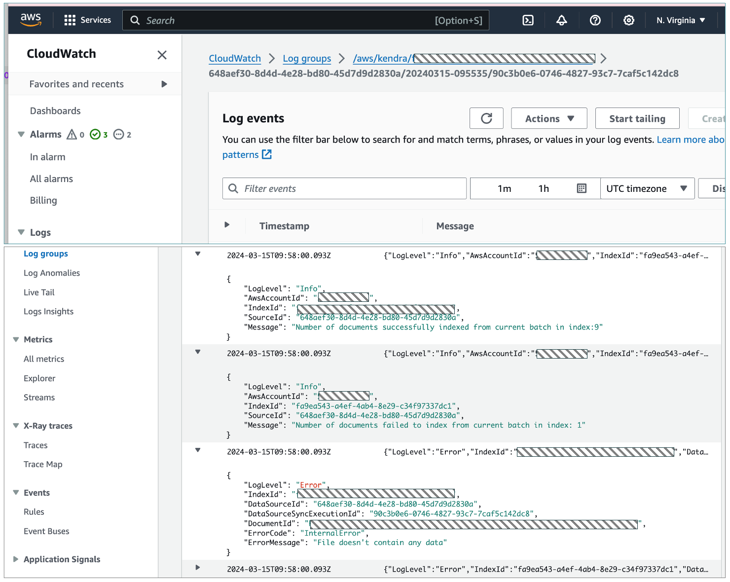 - Look out for CloudWatch logs which gets created under log groups as /aws/kendra/<kendra index id>