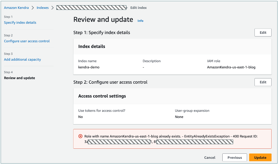- Finally when you click the update button, you get the below error which will get you puzzled. No worries, that’s a bug in Amazon Kendra and you can move forward.