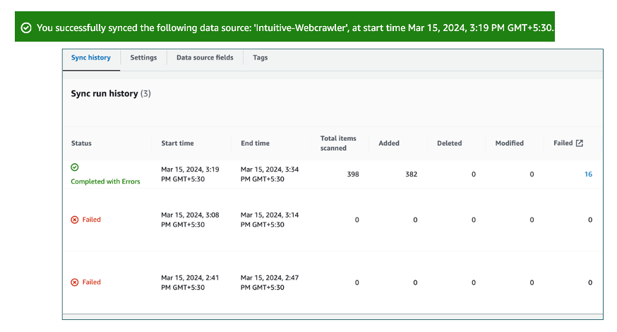 Amazon Kendra is syncing the following data source: 'Intuitive-Webcrawler'. It can take from a few minutes to a few hours. Syncing is a two-step process. First documents are crawled to determine the ones to index. Then the selected documents are indexed. Sync speeds are limited by factors such as remote repository throughput and throttling, network bandwidth, and the size of documents.