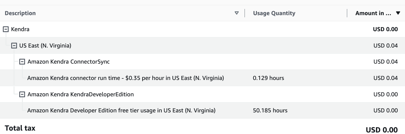 Here is the Amazon Kendra service wise billing for this blog exploration.