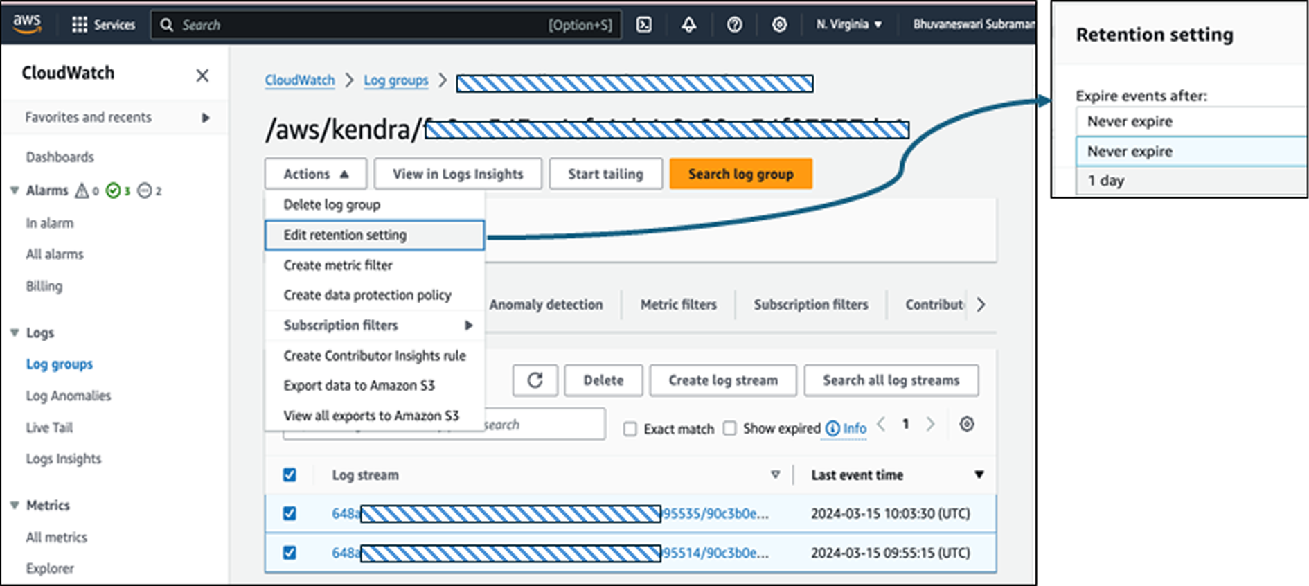 - Since you have deleted the Kendra index, it’s time to clean-up CloudWatch logs too. Hence go ahead and change the retention setting to expire by 1 day]