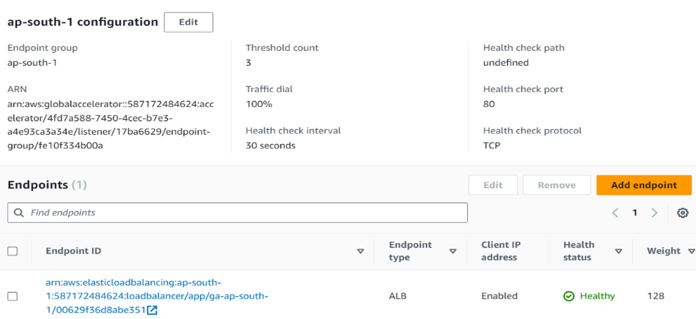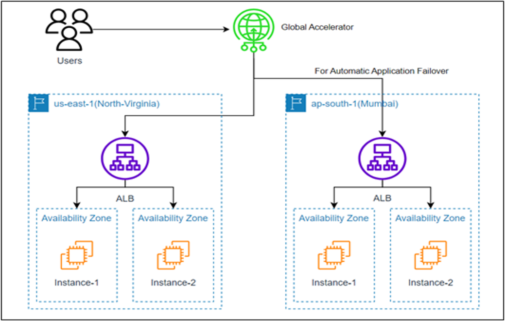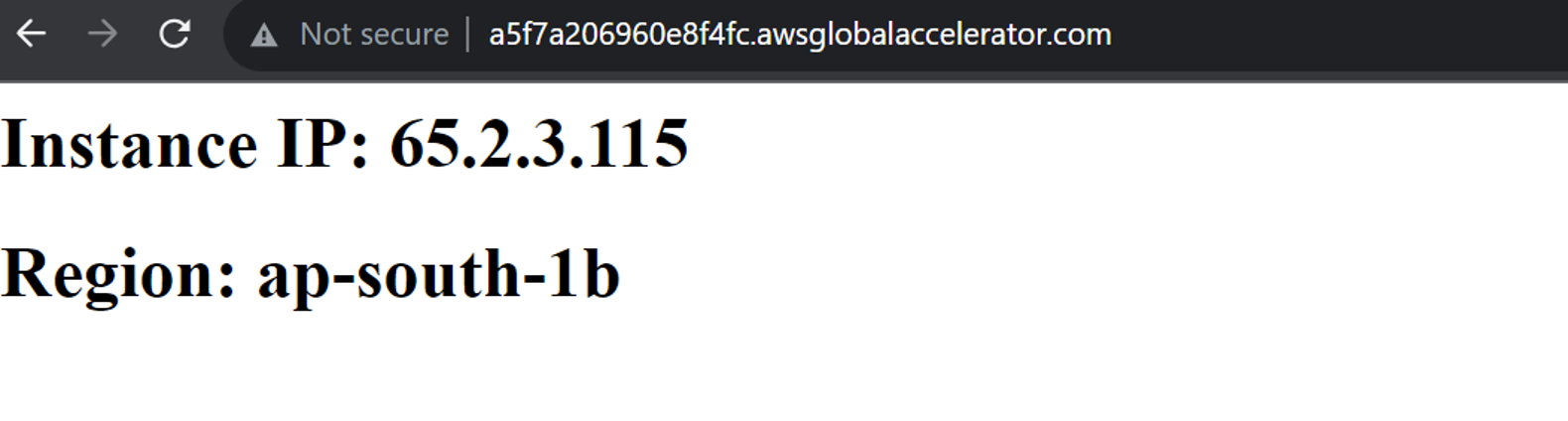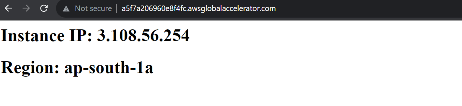 Each group has its own ALB that is specific to its region. - Step 3: Once Global Accelerator is configured and the corresponding DNS is set, users in the Asia Pacific (Mumbai) region can access the application.
