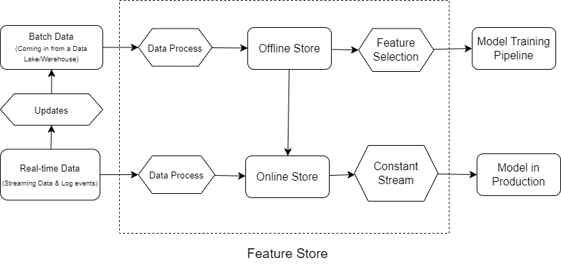In other words, it is used to provide online features that are relevant to a ML model in production. The above diagram provides a high-level view of a feature store.