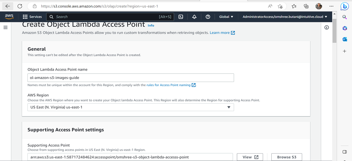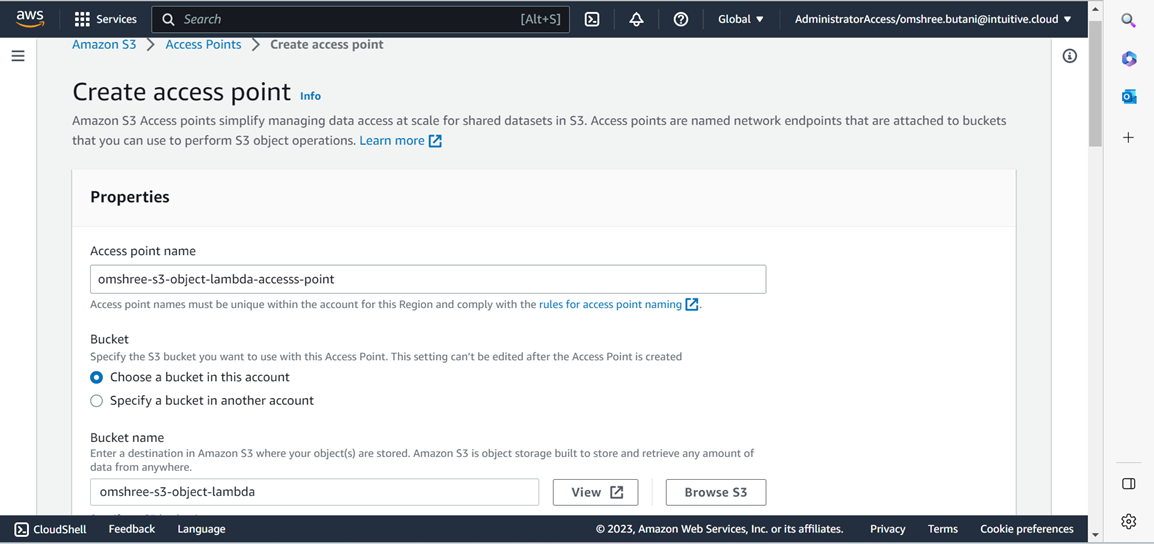 - In the "Properties" section, provide a name for the access point and click the "Browse S3" button to select the desired bucket name entered in Step 1.