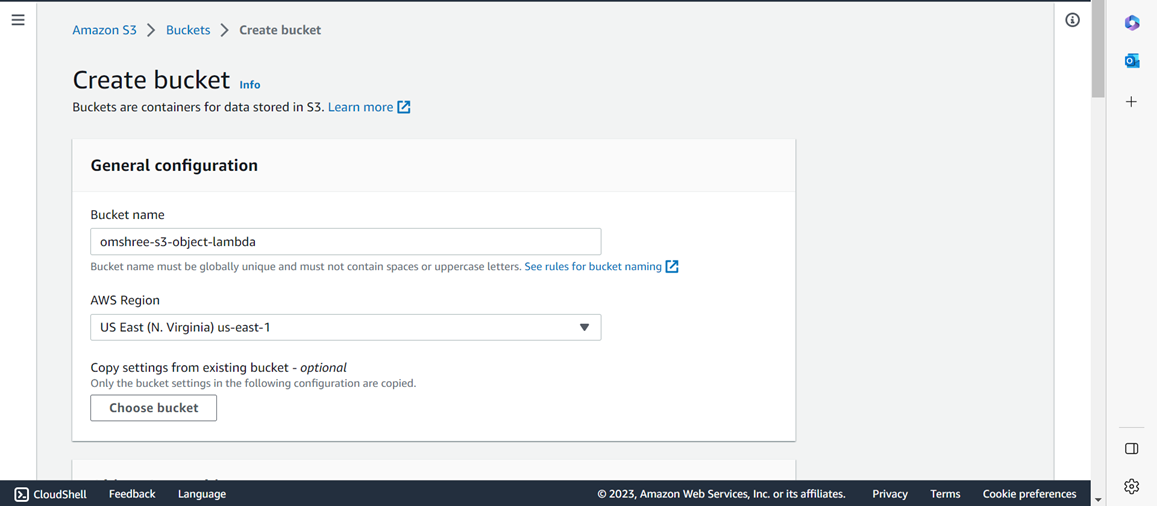 - Choose the AWS Region where you want the bucket to be created. Note that another resource in this tutorial will need to be in the same AWS Region.