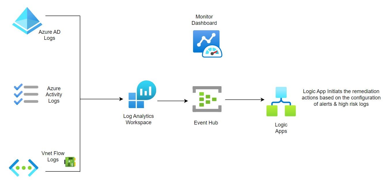 With centralized monitoring and logging, Azure AD logs, user activity, and Network flow logs are aggregated in log analytics workspace & dashboard is created in Azure monitor for better visibility. Logic apps are configured to be triggered from event hub based on the log analytics events, and resource utilization thresholds.