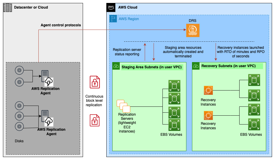 AWS Elastic Disaster Recovery supports continuous replication, which means that any changes made in the source environment are reflected in the disaster recovery site within seconds. The customer was able to significantly reduce their recovery time objective (to a few mins), which is the length of time necessary to recover from a disaster after notice of service disruption. It has also significantly reduced its recovery point objective (to a few minutes)—the period that data loss may be tolerated.
