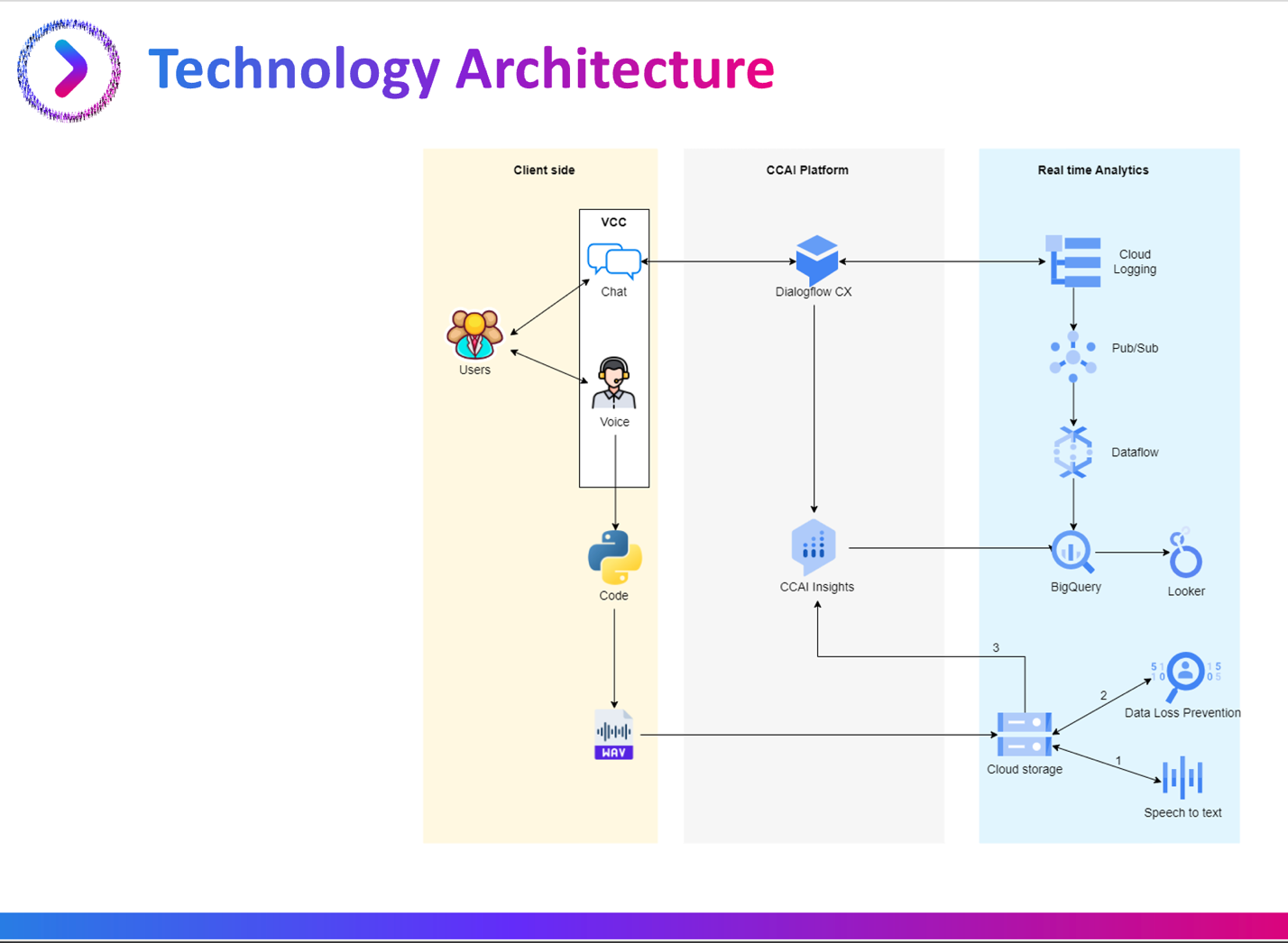 To address the challenges identified, we proposed the architecture depicted below. In our solution, users were offered two options: engagement with the Virtual Contact Center (VCC) or communication with a voice-enabled agent. Opting for the VCC directed users to the Contact Center AI Platform on Google Cloud, where Dialogflow CX was employed to generate responses. Alternatively, if users chose to speak with an agent, their conversations were recorded, and the files were securely stored in the cloud.